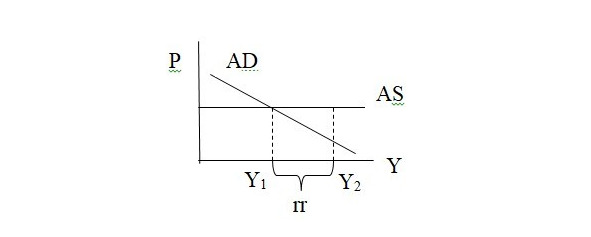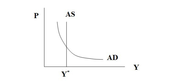 На модели инерционность производства отразилась через превращение кривой АS в прямую вертикальную линию (Y*) Теперь она отражает постоянный объём производства, не зависящий от цены товара (Рис. 2.4).