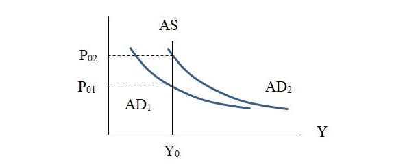 Предположим, что на рынке с совокупным равновесным спросом Y0 по какой-то причине этот спрос повысился. Причём, дело не в цене. Например, повысились доходы граждан. Это изменение величины спроса не может быть отражено перемещением точки равновесия по кривой AD1 вправо (в сторону увеличения) по той причине, что оно не является функцией цены. Поэтому его нужно отображать перенесением всей кривой вправо в положение AD2. Новая точка пересечения кривых спроса и предложения станет точкой нового равновесия с ценой Р02. Эта новая цена сложится очень быстро, т.к. высокая эластичность цены является базовым предположением неоклассической теории. В итоге вновь наступает равновесие. Кризис не наступил.