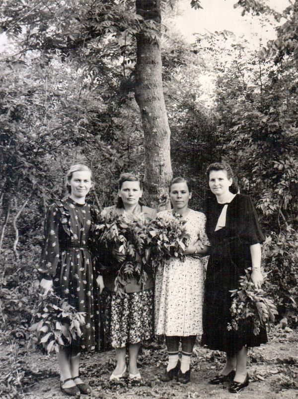 Преподаватели средней школы совхоза Максима Горького. С права налево: Короткова Надежда Лаврентевна, Мосева Мария Николаевна, Ванацкая Юлия Иосифовна и Харольская Надежда