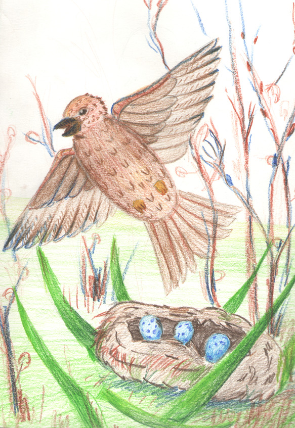 Я стоял над гнездом. Жаворонок всё плакал и просил меня не трогать его домика. А я думал себе: «Разве можно обижать такую птичку, которая людям приносит только радость и пользу? А сама так бедно живёт при этом: ямка от лошадиного копыта, да куст полыни над ямкой».