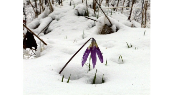 Возле снегового островка взгляд мой поймал… Нет, не может быть! Пробив большую толщу крупитчатого снега, над ним распростёрся крупный и жаркий кандык. Казалось, это горит маленький, но неистовый костёр, расплавляя остатки ещё несколько дней назад лютовавшей зимы.