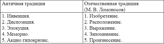 В «Риторике» М. В. Ломоносов предложил удобную структуру риторического построения (см. табл. 1):