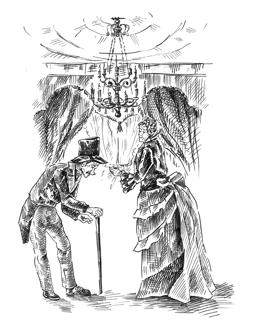 Тем временем экипажи гостей один за другим прибывали в усадьбу. Приехали Нестеровы, причем, хранительница очага в коляске, а глава семьи верхом на необыкновенно красивом жеребце. Через некоторое время пожаловали Бершовы и Зацепины, за ними Измайловы и Петины. Последних возглавлял Игнатий Леонидович, старик лет семидесяти пяти с седой головой, слезящимися глазами и бородавкой на кончике носа. Ни на кого не глядя, он сразу засеменил к матери Извольского.