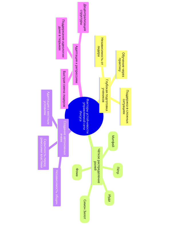 Управляемая сеть также обеспечивала безопасность движения. В условиях, когда Римская империя регулярно расправлялась с потенциальными мятежниками, открытая организация могла быть уничтожена на ранней стадии. Однако небольшие группы, работающие автономно, могли действовать скрытно, не привлекая внимания властей. Позже, когда христианство распространилось по империи, этот же принцип сыграл ключевую роль в его выживании. Ранние христианские общины существовали по сети ячеек, каждая из которых могла функционировать независимо, что делало невозможным уничтожение всего движения путём ликвидации его центрального руководства.