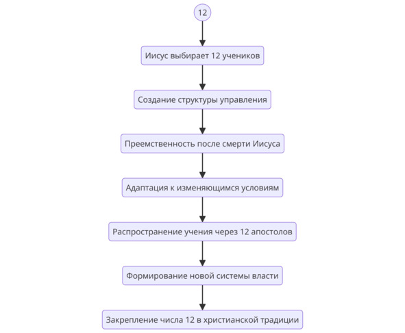 Таким образом, выбор Иисусом 12 учеников не был случайным ни с религиозной, ни с психологической, ни с управленческой точки зрения. Это решение имело глубокий символический смысл, укоренённый в библейской традиции, создавало впечатление легитимности его миссии и обеспечивало эффективную передачу учения. Число 12 воспринималось как знак божественного порядка, что позволяло укреплять движение и создавать его идеологическую основу. Кроме того, этот выбор обеспечивал структурированность и устойчивость сообщества, делая его неуязвимым для репрессий и внешнего давления. В результате эта стратегия позволила движению Иисуса не только выжить после его смерти, но и превратиться в мощную систему, которая в итоге поглотила саму Римскую империю.