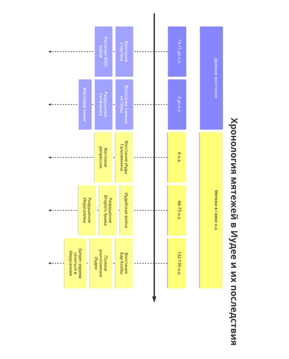 Великая Иудейская война 66—73 годов н. э. стала крупнейшим восстанием против Рима. Первоначально повстанцы добились успехов, разгромив римские гарнизоны и провозгласив независимость Иерусалима. Однако ответ Рима был беспощаден. В 70 году н. э. войска Тита штурмом взяли Иерусалим, уничтожили Храм, а город был практически стёрт с лица земли. По свидетельствам Иосифа Флавия, было убито более миллиона человек, а десятки тысяч евреев были проданы в рабство.