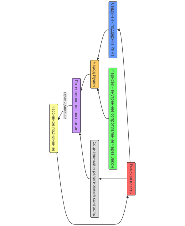Социальная структура также способствовала страху перед открытым мятежом. В отличие от традиционных революционных ситуаций, где бедность и отчаяние приводят к восстаниям, в Иудее действовала мощная религиозная элита – саддукеи, которые поддерживали Рим. Они выступали в роли посредников между римскими правителями и народом, разъясняя законы, взыскивая подати и подавляя любую форму открытого недовольства. Для большинства иудеев Рим был далёкой, но могущественной силой, а реальную власть в их повседневной жизни осуществляли храмовые власти.