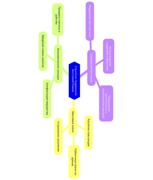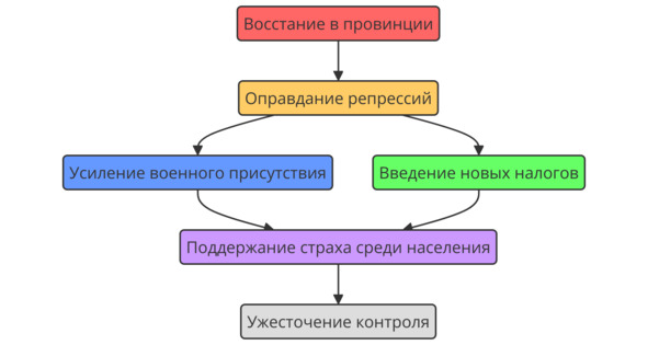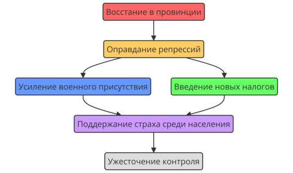 Как Рим использовал восстания для усиления контроля: стратегия репрессий, экономического давления и увеличения военного присутствия. Диаграмма демонстрирует, как Римская империя использовала восстания в Иудее и других провинциях для ужесточения власти, введения новых налогов и поддержания страха среди населения.