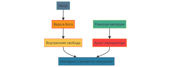 Блок-схема, демонстрирующая, как Иисус создал идеологическую альтернативу Римской империи, заменив культ императора верой в Бога. Показано, как внутренняя свобода и отказ от поклонения земным правителям подрывали влияние империи, делая её власть ненужной. Узнайте, как вера в Бога стала сильнее римской идеологии и привела к трансформации общества