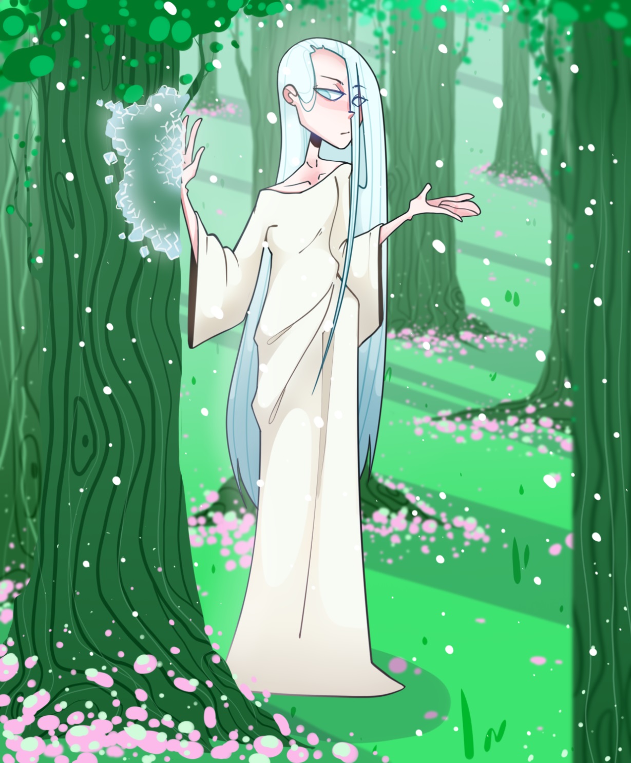 Белый, казалось, только этого и ждал. Он прыгнул на месте, и от него по поляне стала расползаться волна холода, такого лютого, что его можно было видеть. Прибитая дождем к земле трава мгновенно жухла и покрывалась инеем. На стволах деревьев появился морозный узор, а листья превратились в льдинки, звенящие и бьющиеся друг о друга.