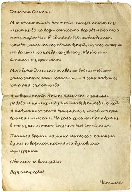 Месяц назад к нам пришла посылка от неизвестного отправителя. В ней лежал амулет и записка от Натальи. Вот она, – Оливия протянула Миле свёрнутую бумажку.