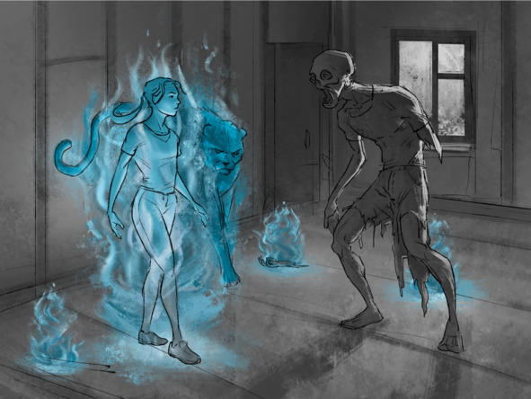Взгляд девушки резко переменился, синий цвет её глаз стал насыщеннее, вокруг тела взвилось синее пламя, в котором отчётливо виднелись очертания чёрного ягуара. Упырь застыл, словно в испуге, смотря на девушку. В её лице изменилось что-то еле уловимое.