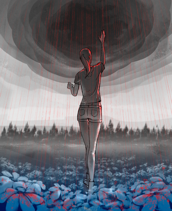 Дождь пошёл сильнее. Капли летели с такой скоростью, что разрезали кожу, опаляя её жаром. Последние цветы потухли. Тьма полностью всё поглотила, оставляя слышным лишь звук разбивающихся капель.