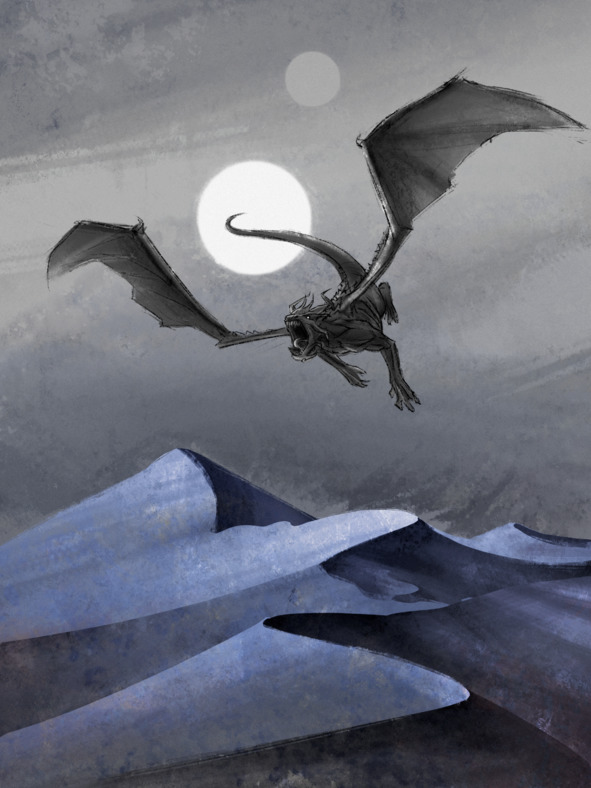 Чёрное размытое пятно пролетело в нескольких метрах от песка, заставляя его подняться в воздух, а скалы треснуть. Улетев на несколько тысяч метров от колонны, резко устремилось вверх и так же резко замерло в воздухе. Затем оно распахнуло величественные крылья, а оглушающий рёв заставил всё содрогнуться ещё раз.
