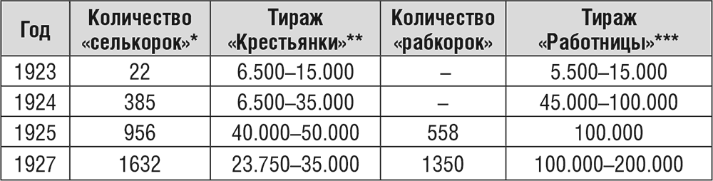 Рост рядов рабселькорок напрямую связывался в партийных документах с ростом тиража, эта зависимость не подтверждается данными таблицы, приведенной ниже: в 1926 г. селькорок больше, чем рабкорок, а тираж у «Крестьянки» сильно отстает от тиражей «Работницы». Точнее будет сказать, что рабселькорки заменяли журналам корреспондентскую сеть по стране.