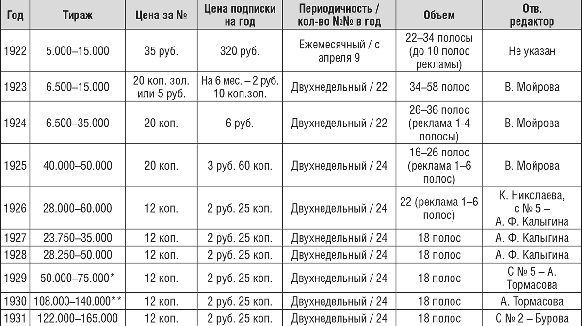 Отмечая пятилетие регулярного выхода журнала, редакция «Работницы» несколько раз публиковала сведения о росте своего тиража. «В 1925 году тираж «Работницы» достигал 63500 экз., а рабкорок было 558; в конце 1927 г. тираж дошел до 165.000 экз., рабкорок же стало свыше 1.350 человек»[150] – отмечается в № 1 за 1928 г.