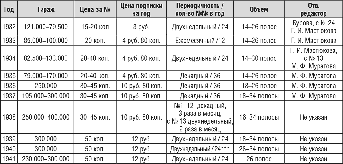 Таблица 4. Сведения о журнале «Крестьянка» в 1922-1941 гг.
