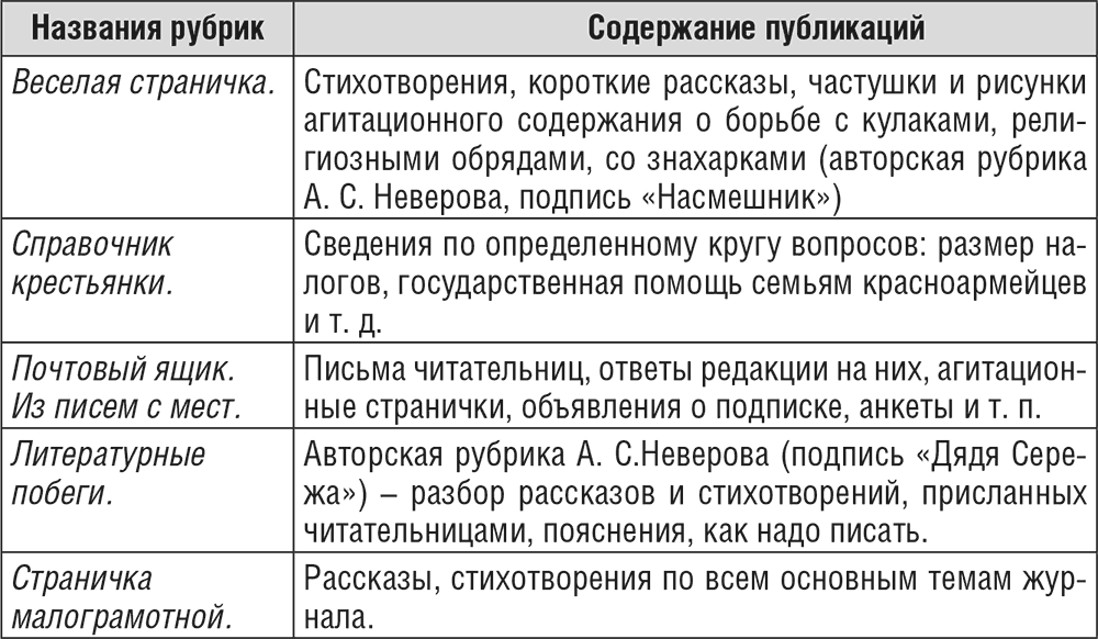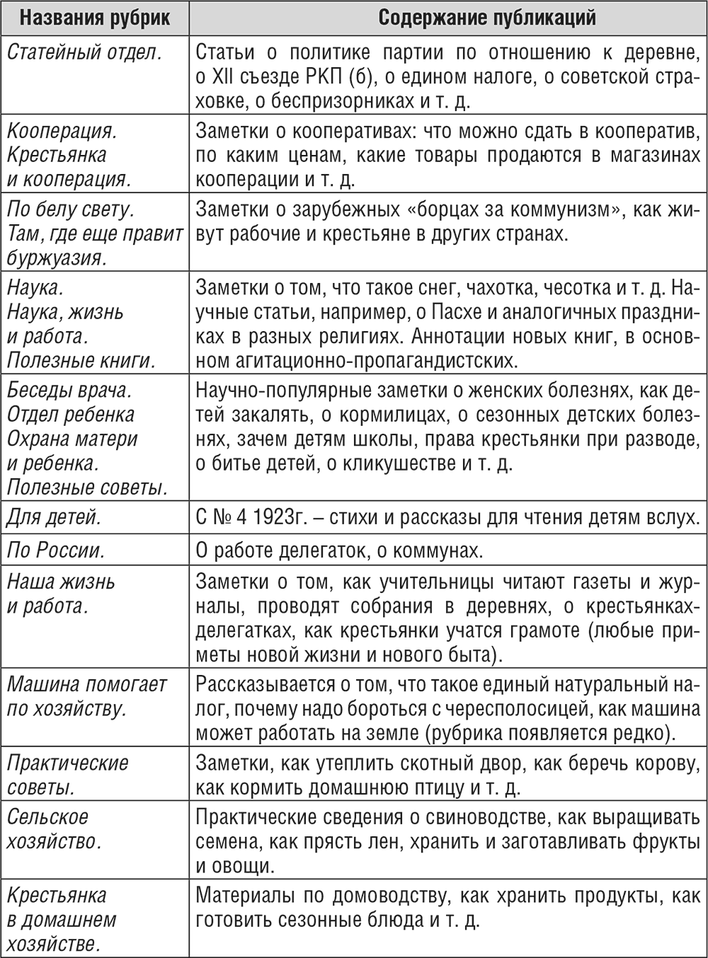 В первом номере «Крестьянки» в 1922 г. рубрик нет, затем они появились, но не были постоянными. В таблице представлены наиболее часто появлявшиеся рубрики. Содержание рубрик могло меняться; заметно, как они дублируют друг друга. Чаще всего рубрика придумывалась под конкретную публикацию. Характеристика содержания рубрик, приведенная ниже, показывает основные темы журнала.