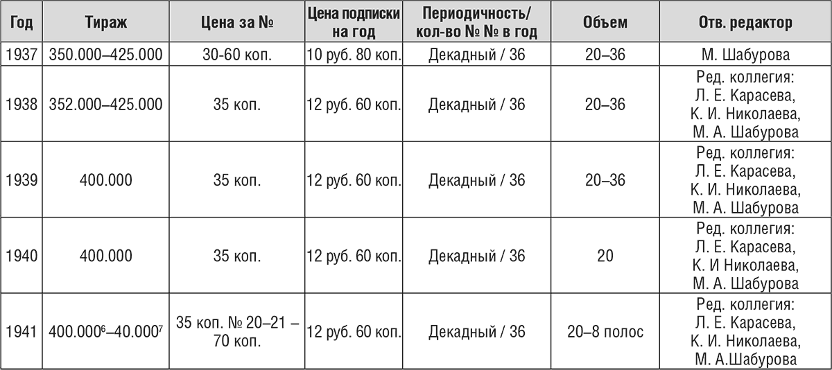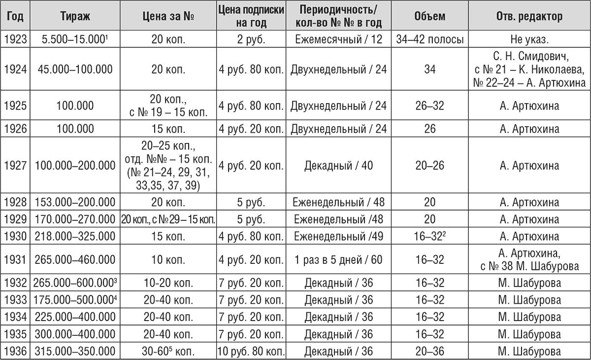 Менялся также объем одного номера: чем чаще выходил журнал, тем меньше был его объем: от 34–42 полос в 1923 г. (выходит 1 раз в месяц) до 16–20 полос в 1927–1941 гг. (выпускается 4, 5, затем 3 номера в месяц). Как правило, с 1930 г. (когда журнал начал выходить 3 раза в месяц) обычный объем 16–20 полос, а каждый третий номер – 32 и более полос. Объем одного номера журнала мог увеличиться, если это был, например, выпуск к 8 марта[193] или юбилейный выпуск (15-летие Октябрьской революции[194]).