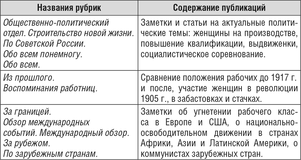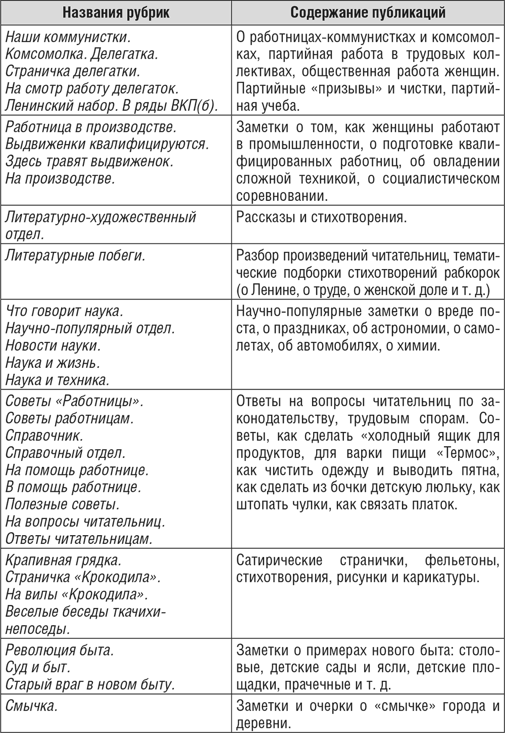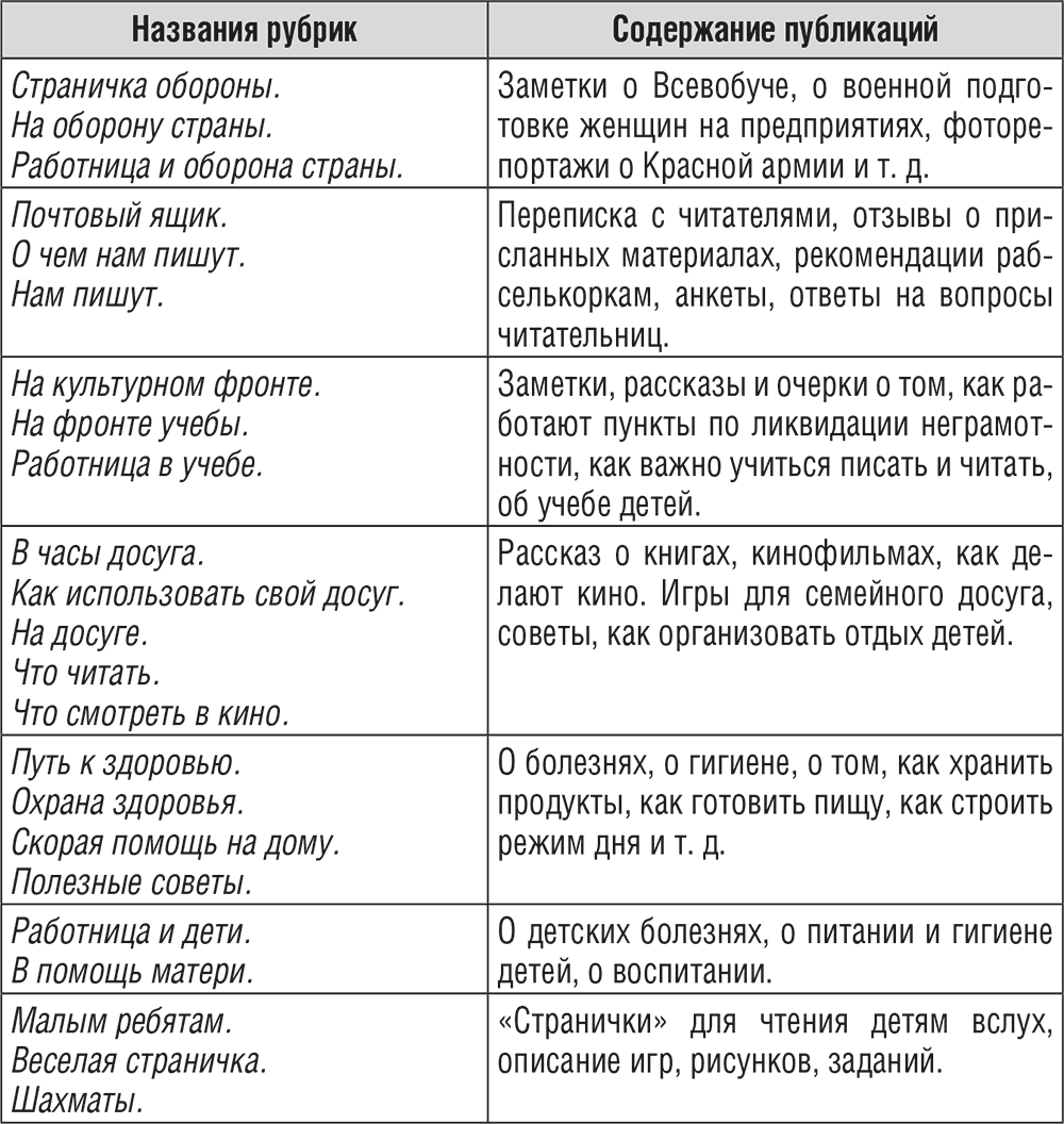 В таблице представлены наиболее часто появлявшиеся в «Работнице» рубрики. Характеристика содержания рубрик показывает основные темы журнала.