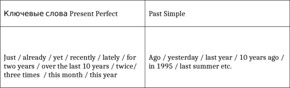 Наречия just (только что), already (уже), yet («еще нет» в отрицательных и «уже» в вопросительных предложениях) являются указателями на то, что необходимо использовать Present Perfect. Например: