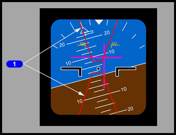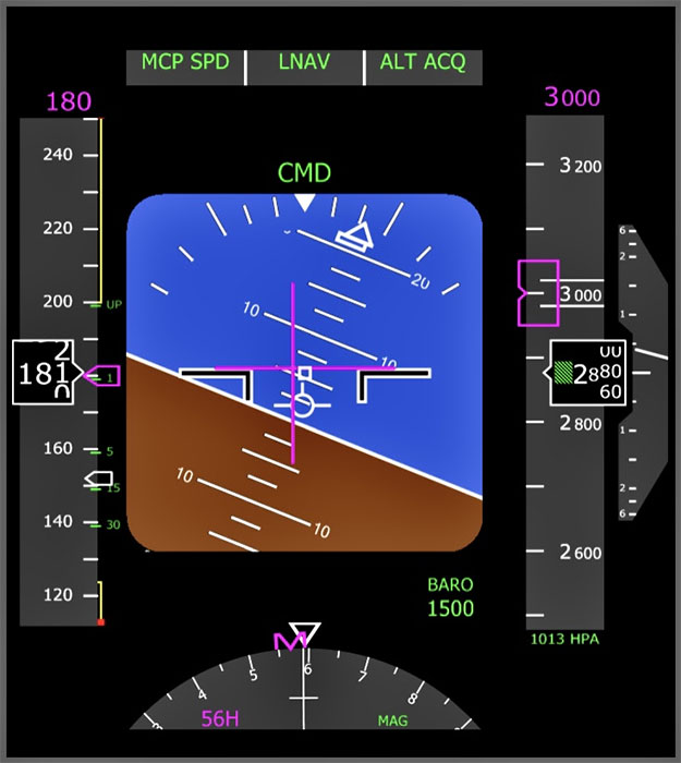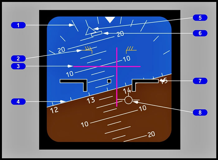ADI показывает, как расположен самолет: наклонен вбок (крен), поднят или опущен нос.