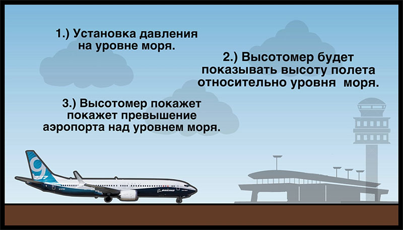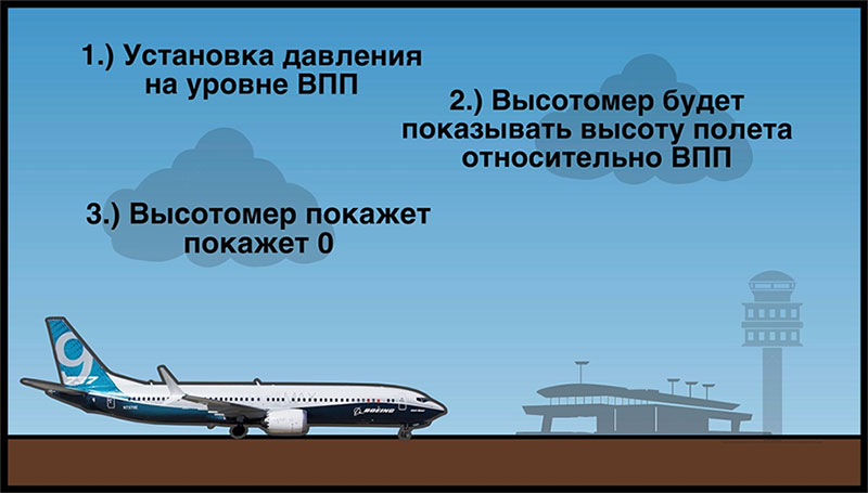 Перед взлетом пилот может установить давление QFE [кью-эф-и]. Это давление у ВПП взлета. Высотомер возьмет его за начальное давление. От него он будет отталкиваться при расчете высоты.