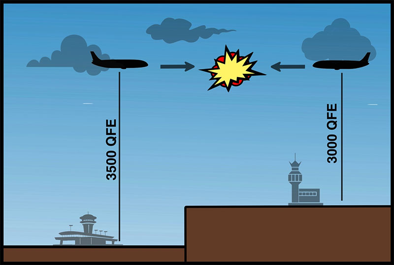 Что произойдет, если каждый самолет будет отмерять высоту относительно аэродрома вылета (QFE)? В небе начнётся хаос! У каждого самолета понятие высоты «0» будет разное.