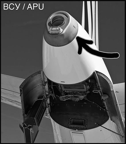 2.) От ВСУ. Вспомогательная силовая установка – маленький «двигателёк-генератор» в хвосте самолета. Он вырабатывает энергию и дает воздух (рис. 1.1). После запуска двигателей ВСУ отключается. Генерировать энергию и давать воздух будут двигатели.