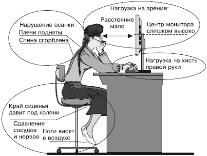 Нагрузка на организм человека при работе (игре, чтении) за компьютером в целом напоминает ту, которая оказывается во время чтения книг или письма. Однако с чисто физической стороны она обладает тремя важными особенностями.