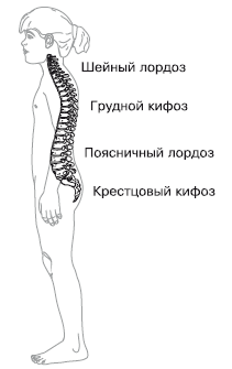 • В норме позвоночник обладает несколькими физиологическими изгибами в переднезаднем направлении, уравновешивающими друг друга (рис. 1.2). Глубина лордоза в шейном и поясничном отделах позвоночника соответствует толщине ладони данного человека. Во фронтальной плоскости остистые отростки всех позвонков располагаются на одной вертикальной линии: при осмотре со стороны спины позвоночник должен быть прямым. Это считается нормой. Формирование изгибов позвоночника начинается с рождения, заканчивается в шесть-семь лет и закрепляется к 14–17 годам.