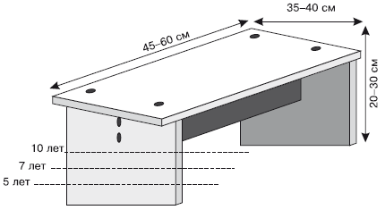 Очередной принципиальный шаг – конструирование скамеечки или подставки для ног. Без нее обустройство рабочего места теряет смысл: под ногами обязательно должна быть прочная опора. Для этого понадобятся четыре куска деревоплиты (можно от старой мебели), десяток шурупов и столярные навыки в объеме, полученном на школьных уроках труда (рис. 1.3). В первый раз высота подбирается опытным путем в зависимости от роста ребенка. Крышку желательно делать с небольшим наклоном в сторону сидящего. В дальнейшем достаточно раз в год немного подпиливать каждую из опор, как показано на рисунке пунктирной линией. Разумеется, домашний умелец может сделать и более изящную, регулируемую конструкцию – найти материалы и любую фурнитуру сегодня несложно.