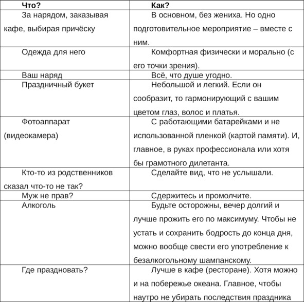Что он предпочитает: традиционный выкуп невесты или поездку к святым местам, 80 приглашенных родственников или скромный ужин в итальянском ресторане для вас двоих и ваших родителей? Отнеситесь с уважением к его пожеланиям. А блеснуть и пригласить 80 человек можно и на свой день рождения. Здесь, как и практически в любом деле, можно и желательно найти компромисс. Главное, чтобы праздник стал таковым для вас обоих – для вашей теперь уже единой семьи. Иначе говоря, задача – постараться избавить и себя, и мужа от ненужных переживаний и сделать этот день радостным и запоминающимся.