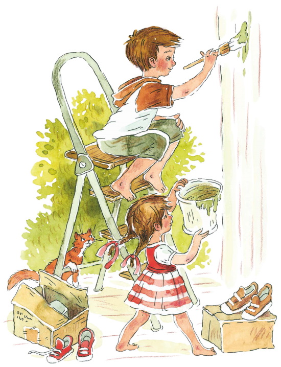 Вовка с Хвостиком, осмелев, подошли к Динке с ведром краски и большой картонной коробкой. Присев на лесенку, они тоже огорчённо стали вздыхать, подталкивая друг дружку в бок.