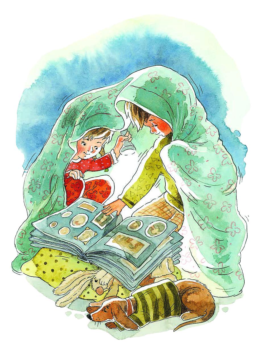 Уютно устроившись на полу и накинув одеяло поверх головы, дети открыли пыльный альбом. Разглядывая фотографии, Вовка и Хвостик пытались предположить, каким родится их маленький брат.