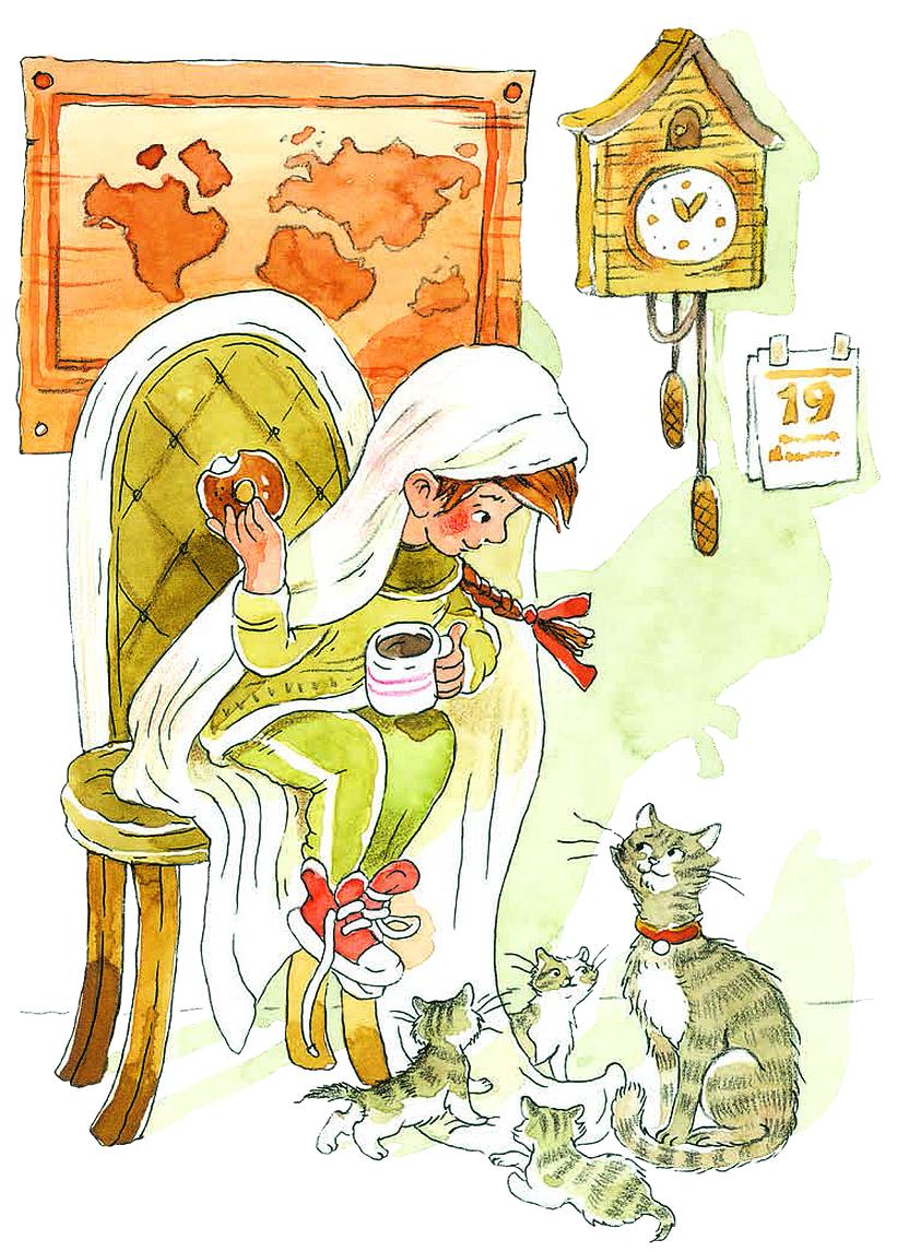 От такого заманчивого предложения Соня совсем не могла отказаться. Точнее, она скромно села на край стула и взяла всего три пончика. И те мигом пропали за Сониными щеками. За этими тремя, следом, отправились ещё четыре, а потом ещё один. Последний еле влез. Соня запила его компотом и решила, что пора домой.