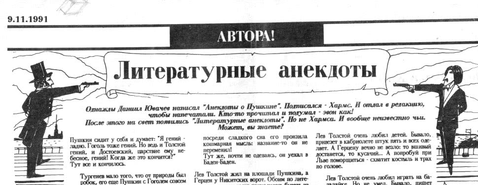 А в том, что это Хармс, я усомнился с самого начала. Веселый хулиганский юмор этих анекдотов был совсем чужд тяжелому хармсовскому макабру. Но кто был истинным автором, мне довелось узнать лишь много позже.