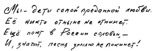Лишь в голосе сердца такое раздолье,Что вольным напевам внимает судьба.И слушают птицы,И слушает поле,И слушает небо тебя.Сегодня в России мелодиям тесно.Со сцены покорно ушли голоса.Но ты моя радость,Но ты моя песня,А все остальное – попса.Сейчас наша песня уходит в подполье,Сейчас наша песня почти не слышна.И только надеждаНа вольную волюРазбудит людей ото сна.Я знаю, я верю, что ты не уступишьНи сладостной лести, ни злу, ни рублю.А сердце не купишь,И счастье не купишь,Не купишь улыбку твою.Мы нынче живем приземленно и пресно.Забыли мы небо и звездную даль.Но ты моя радость,Но ты моя песня,И свет, и полет, и печаль…Так пой, дорогая! Последней любовьюОзвучена наша земная судьба.И слушают птицы,И слушает поле,И слушает небо тебя.«Понимаешь, одни…мы остались одни…»