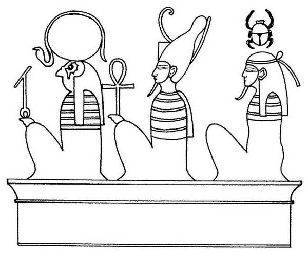Египтяне не придерживались определенных правил при изображении богов. Так, одно и то же божество могло выступать в облике животного, человека или полузверя-получеловека. Некоторые боги в различных городах носили разные имена. Одно и то же явление реальности могло воплощаться в разных божественных образах: например, утреннее солнце олицетворял бог Хепри в виде жука-скарабея, катящего по небосводу солнечный диск до точки зенита; дневное солнце представлял Ра – человек с головой сокола, а Атум символизировал вечернее солнце. Хепри, Ра и Атум (рис. 3) были тремя ипостасями одного и того же солнечного божества.