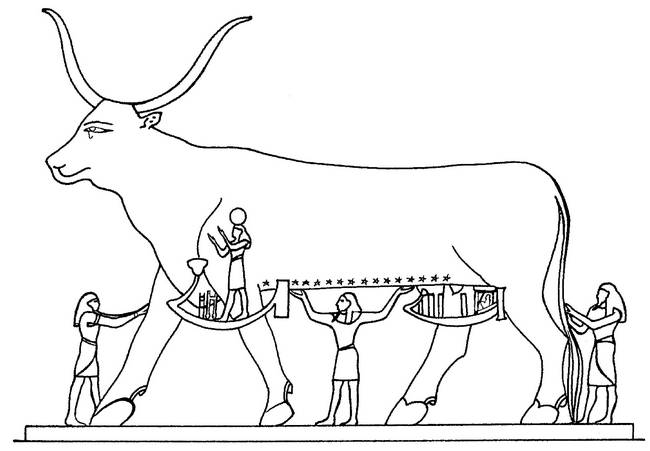 Героями одинаковых мифов в разных египетских городах являлись различные божества. Так, одни источники называли бога Себека, имеющего облик крокодила, другом Ра, другие считали его врагом великого бога Солнца. По-разному представлялись и многие явления окружающего мира. Например, небо могло изображаться в виде крыльев коршуна, реки (небесный Нил), коровы или женщины (богиня Нут) (рис. 4).