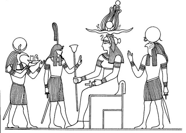 Рис. 8. Свадьба Шу и Тефнут. На троне – Тефнут, перед ней Шу с пером страуса на голове, за ним Тот с головой ибиса, за троном стоит Ра