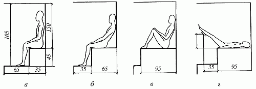 Рис. 1. Виды полков в зависимости от позы парящегося: а – сидя; б – отклонившись назад; в – сидя на полке с согнутыми ногами; г – лежа, положив поднятые ноги на упор