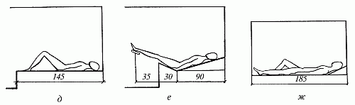 Рис. 1 (продолжение). Виды полков в зависимости от позы парящегося: д – лежа с согнутыми ногами; е – лежа на полке-шезлонге, положив ноги на упор; ж – лежа