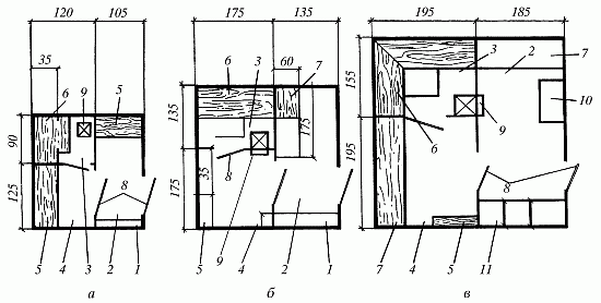 Рис. 2. Бани: а – баня для 1–2 человек с размещением сидя; б – баня для 2–3 че-ловек с размещением сидя и лежа; в – баня для 3–4 человек с размещением сидя и лежа; 1 – вешалка; 2 – предбанник; 3 – парная; 4 – моечная; 5 – скамья; 6 – полок; 7 – лежанка; 8 – двери; 9 – электропечь-каменка; 10 – стол; 11 – шкафы
