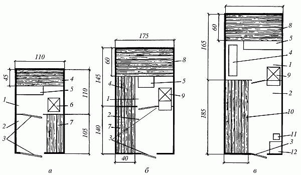 Рис. 3. Малогабаритные бани: а – баня для 1 человека; б – баня для 2 человек; в – баня для 3 человек; 1 – парная-моечная; 2 – предбанник; 3 – двери; 4 – полок для размещения сидя; 5 – подставка; 6 – электропечь-каменка; 7 – скамейка; 8 – полок-лежанка; 9 – печь-каменка для топки дровами; 10 – лежанка; 11 – стул; 12 – стол