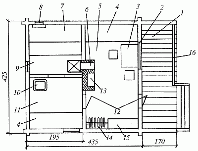 Рис. 5. Баня для 5–6 человек: 1 – терраса; 2 – окно; 3 – стол; 4 – лежанка; 5 – предбанник; 6 – печь-каменка; 7 – полок; 8 – отдушина; 9 – парная; 10 – душевой поддон; 11 – моечная; 12 – двери; 13 – камин; 14 – вешалка; 15 – подставка-скамейка; 16 – перила