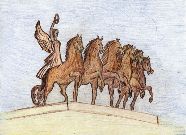 Бежишь, взлететь готовая,У Зимнего дворца,И – эра жизни новаяУ твоего отца.Над аркой штаба ГлавногоУзду квадрига рвёт.Пространство плана плавногоНадвинуто вперёд.Но, лошади! Ах, лошади!Куда несётесь вы:Там, за простором площади —Холодный блеск Невы.А ты бежишь, не ведаяПро близость колесниц,И тает пена белаяНа ярких иглах спиц…Весёлый флаг полощется…И ты на много летОстанешься на площадиШлепками сандалет.