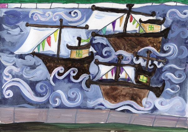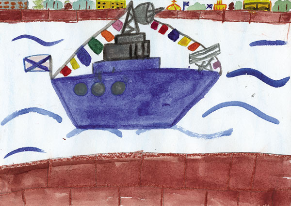Разноцветные флажкиНад Невой трепещут,Озорные гребешкиВ синих волнах плещут.Мы сегодня в первый разНа морском параде;Корабли встречают насВ праздничном наряде.Пётр Первый рвёт уздцы,Весь – порыв и рвеньеИ кричит он: – Молодцы,Всем держать равненье!И застыли кораблиВ праздничном дозоре.Завтра снова от землиУходить им в море.