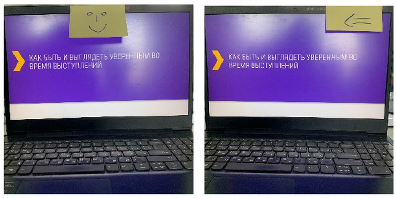 Здесь есть особенность. Если мы будем смотреть на участников, которые отображаются в программе сбоку от презентации, то им будет казаться, что мы смотрим в сторону, как мужчина на рисунке номер 2. Поэтому рекомендуется смотреть в глазок камеры. Со стороны участников онлайн-мероприятия это будет выглядеть так, как будто вы смотрите прямо на них.