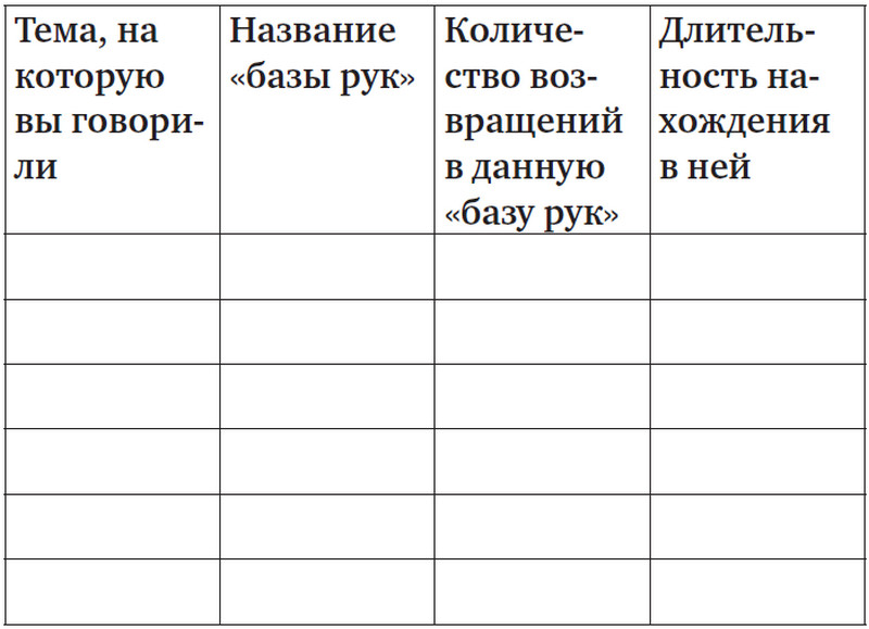 Упражнение 1.1Попробуйте каждую из «баз рук». Постойте в ней 30 секунд. Определите, какая из баз для вас самая удобная. Также выберите запасную «базу рук». В эти базы нужно будет возвращаться каждый раз, когда у вас закончатся жесты.